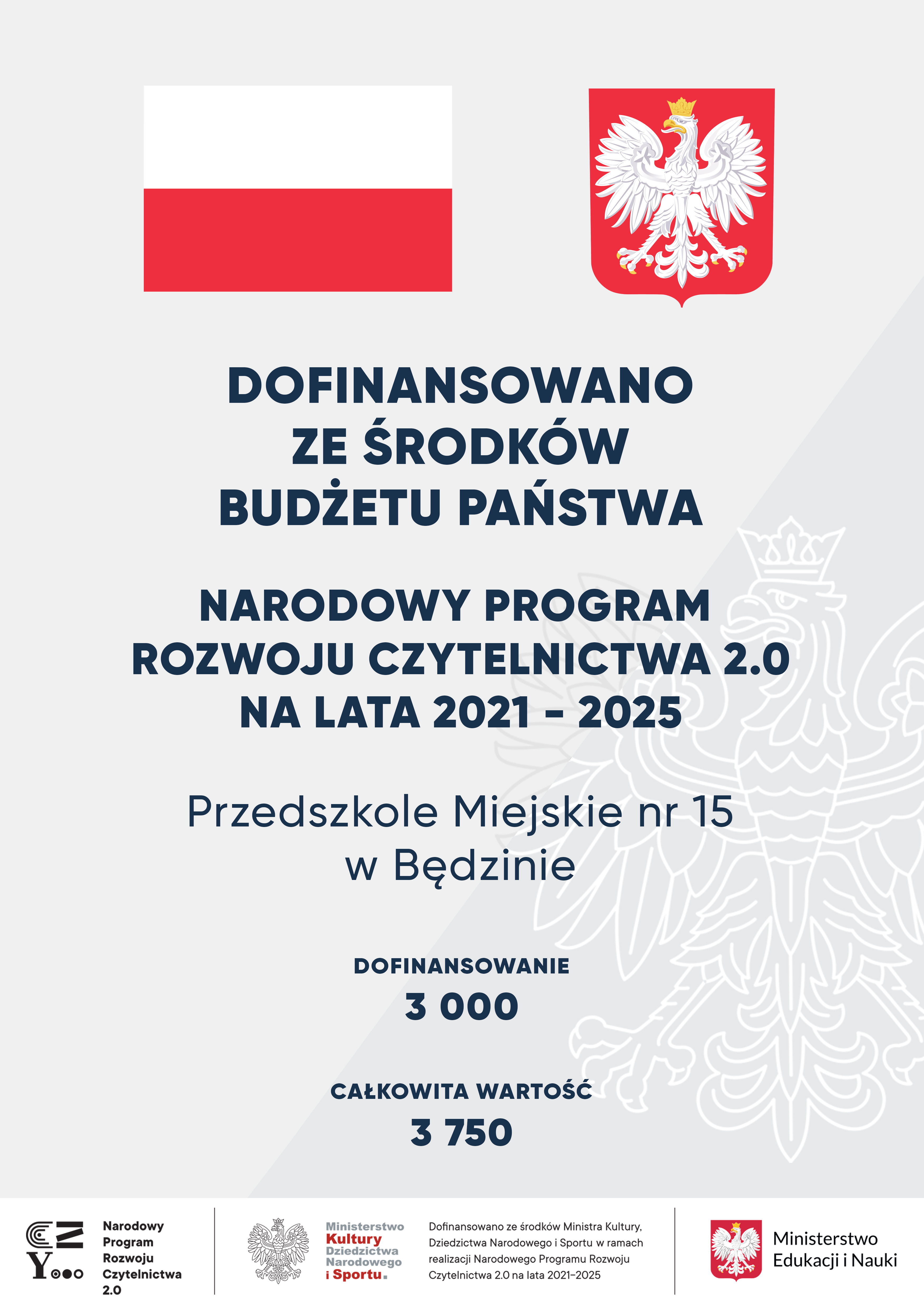 Przedszkole Miejskie nr 15 w Będzinie dostało dofinansowanie do projektu w ramach Programu Rozwoju Czytelnictwa 2.0 na lata 2021-2025.